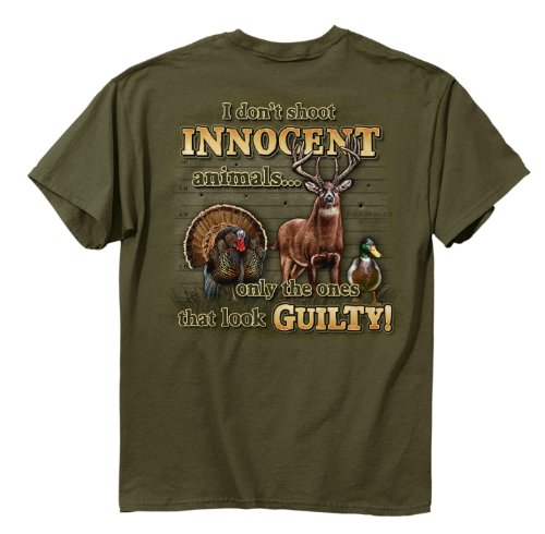 Olive 100% Cotton Tee with Humorous Sporting Graphic "I Don't Shoot Innocent Animals…Only the Ones That Look Guilty" Buckwear Logo on Left Chest