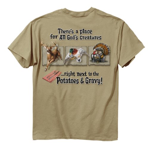 Sand 100% Cotton Tee with Humorous Sporting Graphic "There's a place for all gods creatures, right next to the potatoes and gravy" Buckwear Logo on Left Chest